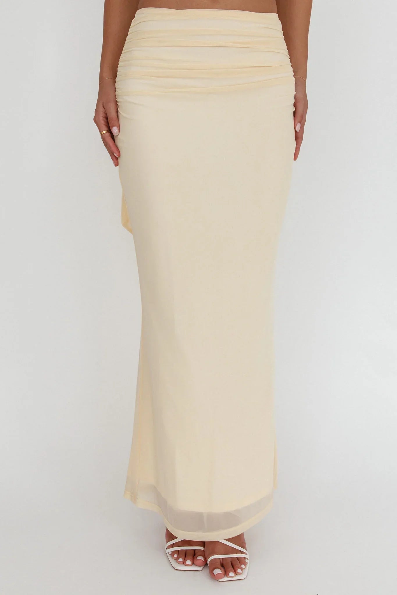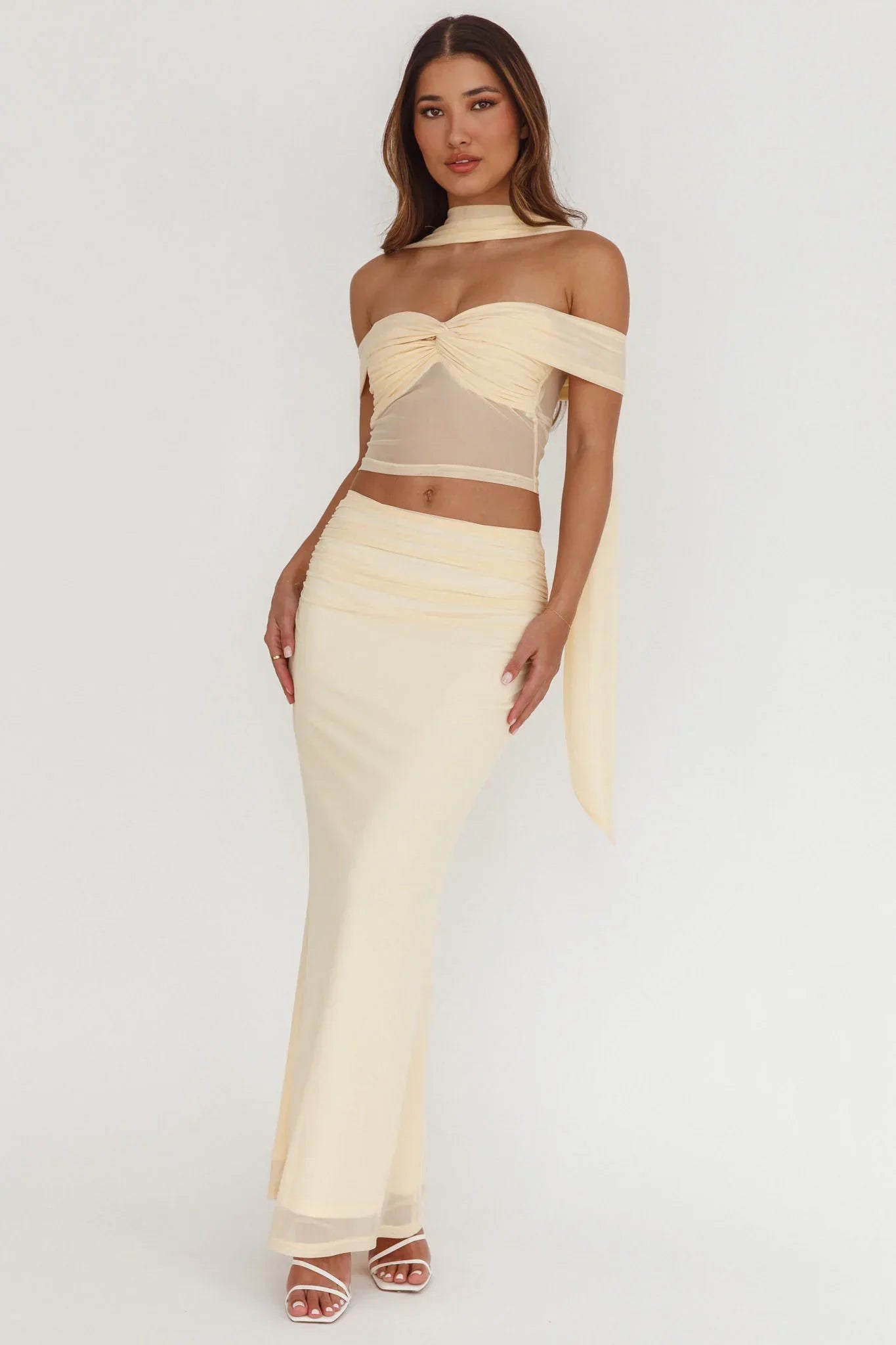 Strut in style in our chic All The Lights midi skirt. It features ruching detail and a mesh overlay and is just what you need for sunset cocktails with your girls. Team it with its matching crop top and heels for a look that will turn heads.
