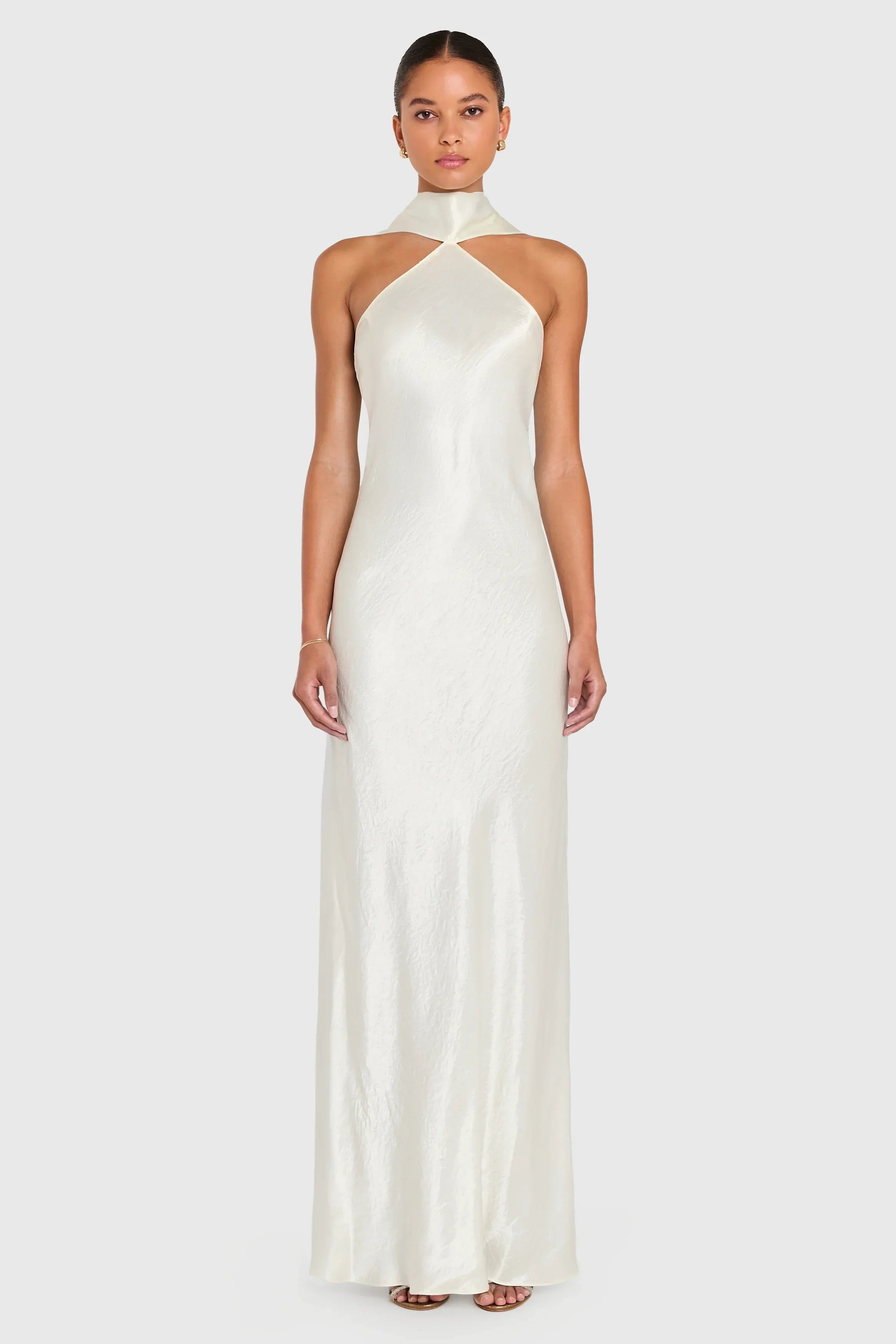 Leave your mark in the Ashton Maxi. Featuring a scarf-like neckline that drapes gracefully down your back, this textured satin dress is made for grand entrances. Pair with gold strappy heels for a fun yet elegant look.