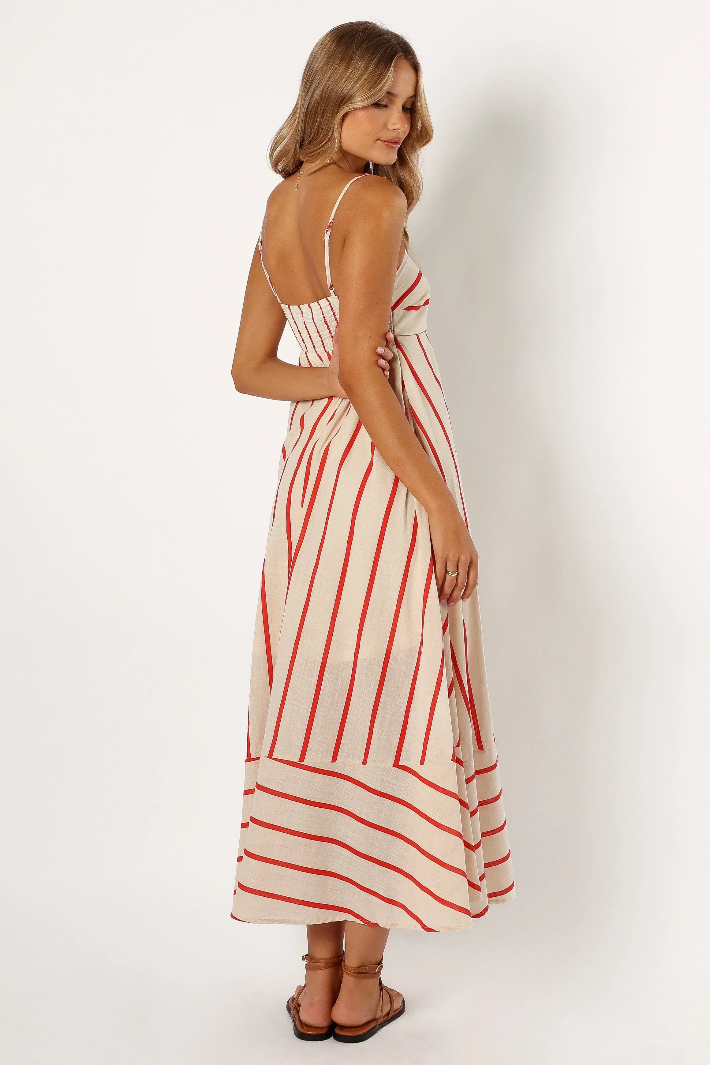 DETAILS This maxi dress is perfect for the summer months! Featuring a straight neckline, thin adjustable straps and an invisible side zip, it's as comfortable as it is stylish. The shirred back panel adds just the right amount of texture while the stripe print design creates a timeless look.