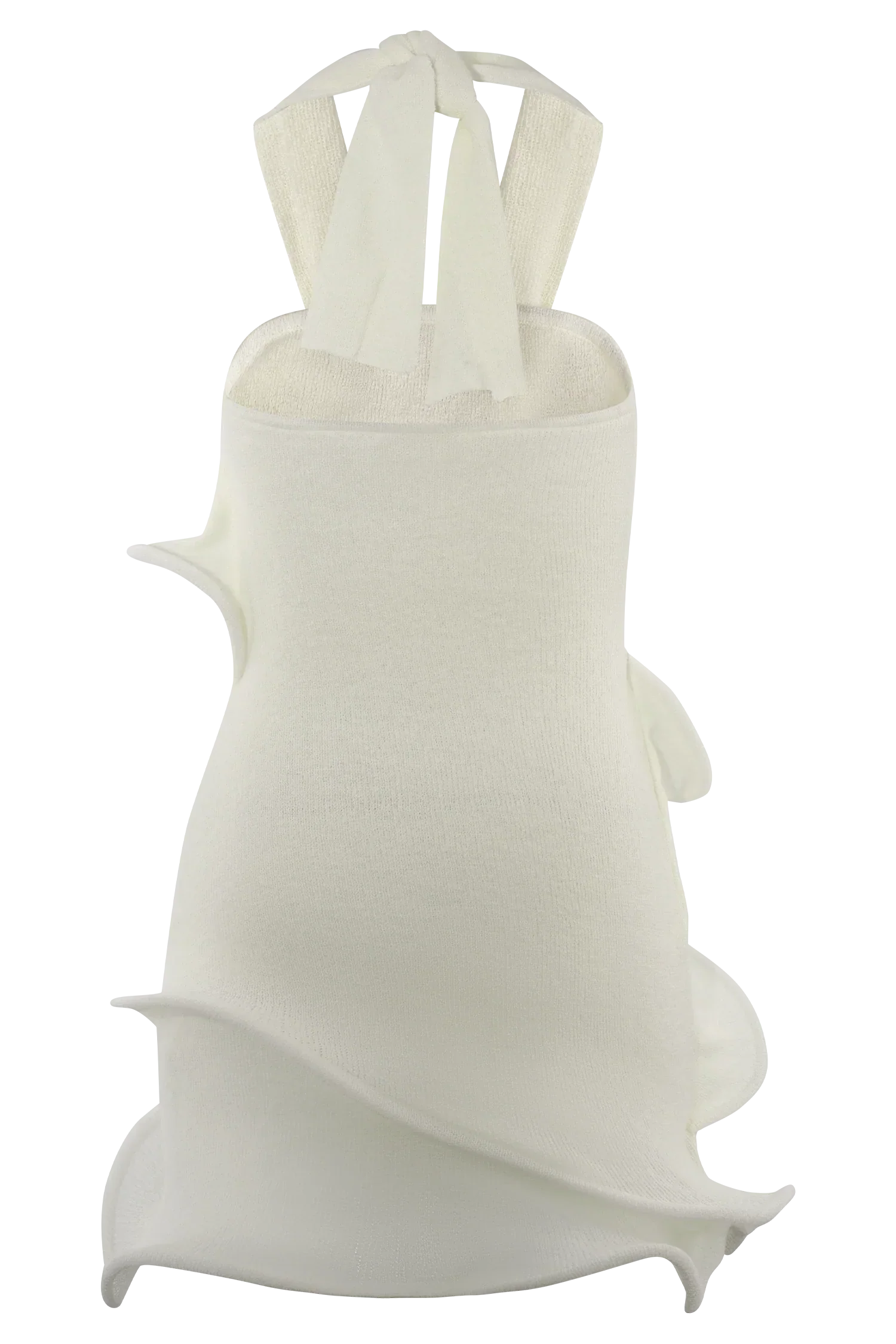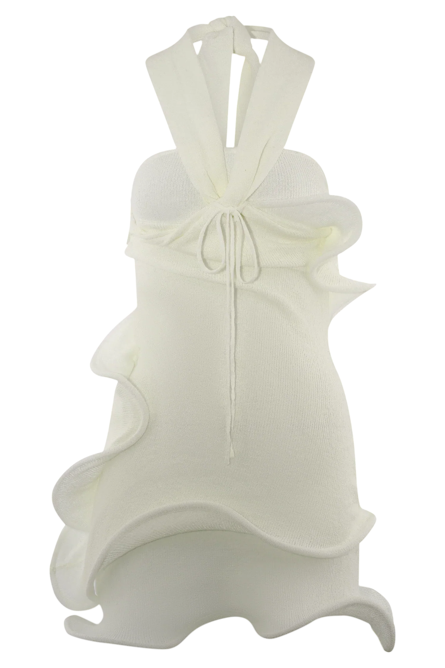 Turn heads in the CAPRICE Halter Knit Mini Dress, a striking silhouette that flows with every step. Featuring a unique twisted halter neckline with an attached scarf detail, this dress brings a sense of drama and elegance to any occasion. The front and back wripple paneling sculpt the body, complemented by a fishtail shape and softly rippled hem for a fluid finish. Unlined for a lightweight feel, this dress is your go-to for elevated evenings and beyond.