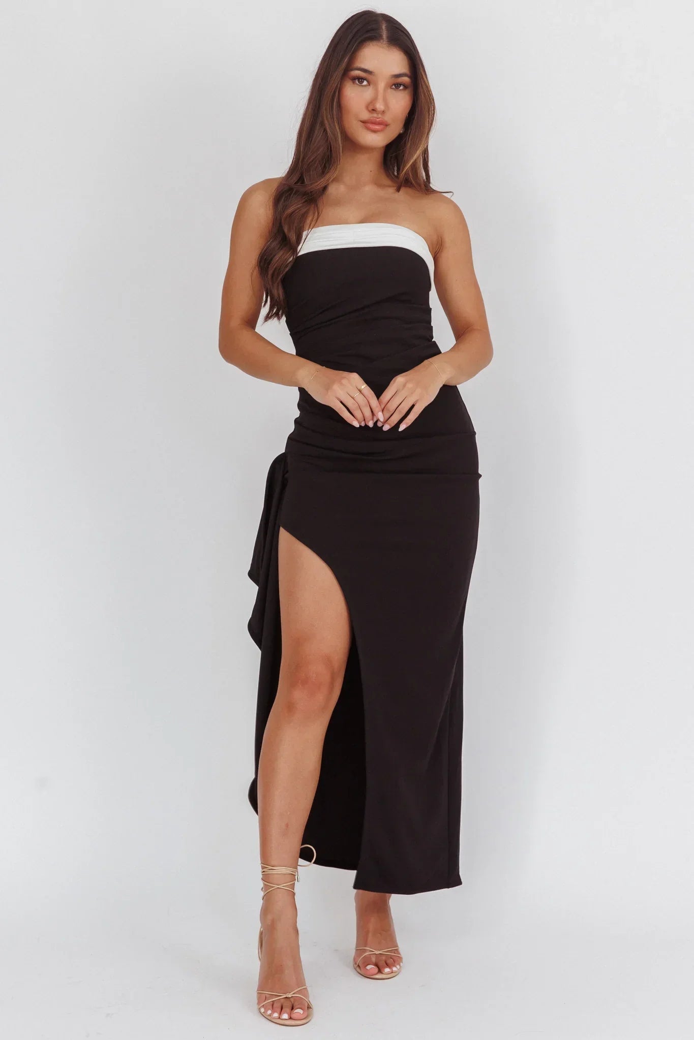 Make them do a double take in our super hot Cha Cha maxi dress. It features a strapless design and thigh-high split and is perfect for dancing the night away in the arms of your lover. Team it with a choker necklace and tie-up stilettos for a look that will have them head over heels.