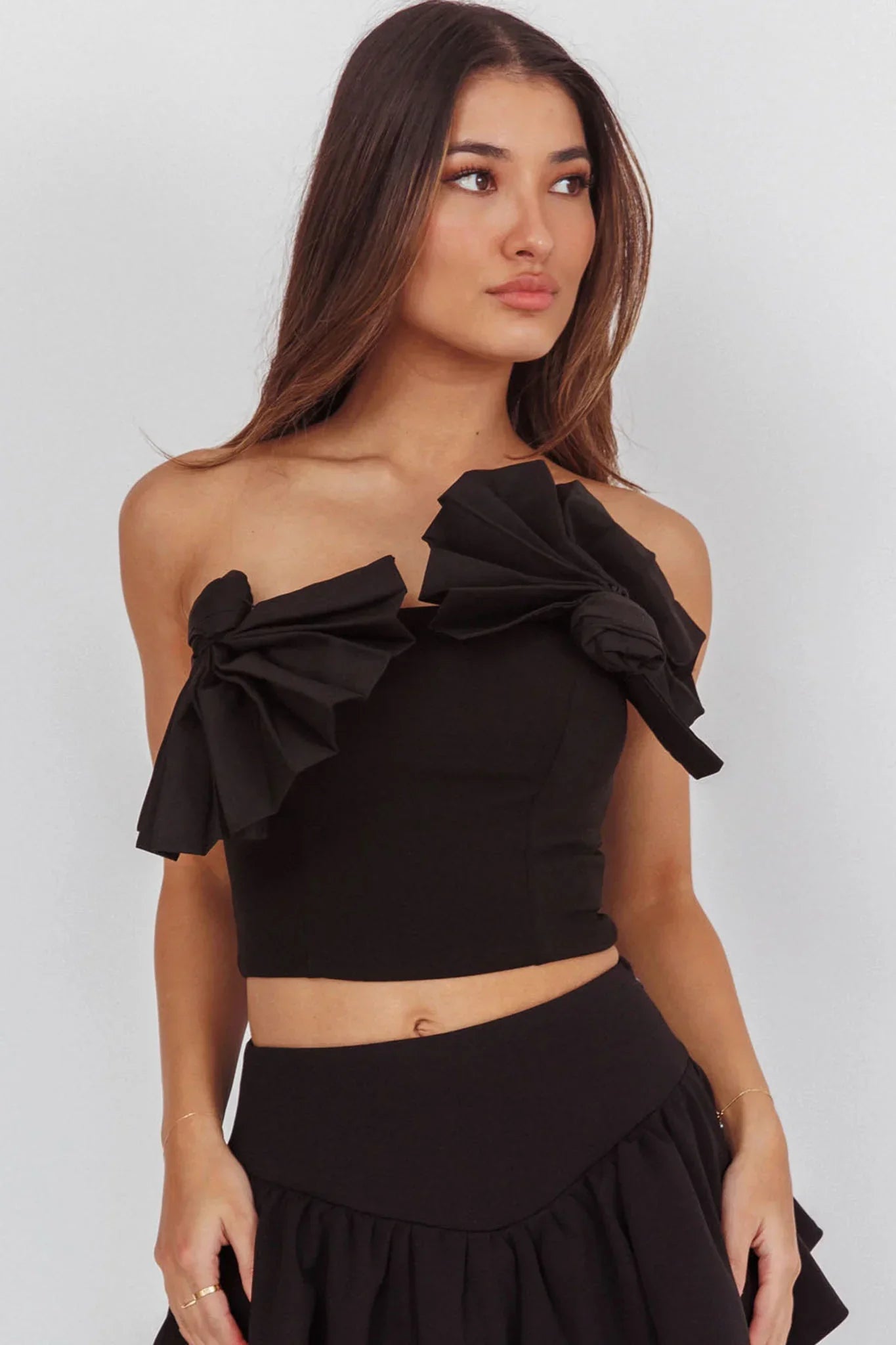 Make a statement in our unique Deisi crop top. It features concertina design decorations in the bust and a strapless design. Perfect for a date night teamed with a mini skirt, black heels and a tote for an unforgettable look.