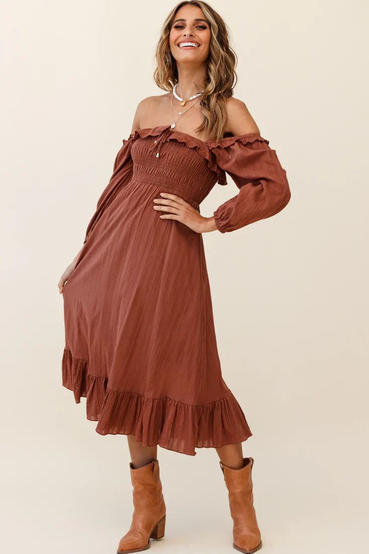 Channel your inner boho babe in our super cute Flynn midi dress. Featuring an off-shoulder style, frill trim, shirred bust and flounce hem. Perfect for a country music festival with your southern gentleman teamed with cowgirl boots and a slouchy tote.