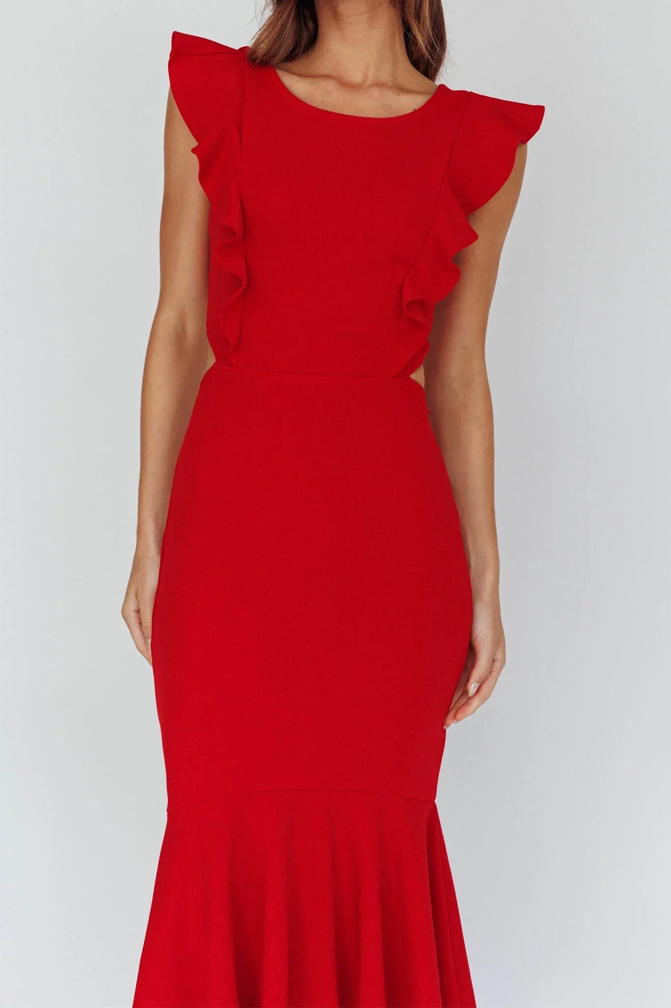 Okay girl, we see you! Own every room you walk into in our Jackie dress. Classy, sassy and a little bad-assy, this structured, pinafore style mid-length dress is balanced perfectly by the wide ruffle, high-low hem and ruffle straps. In addition to hugging you in all the right places, we are loving the little peek-a-boo cutouts at the waist that continue around to the back to give a two-piece illusion. Team it with chunky gold jewelry and a bold lip and we can guarantee they won't be forgetting you too easily. Icon!
