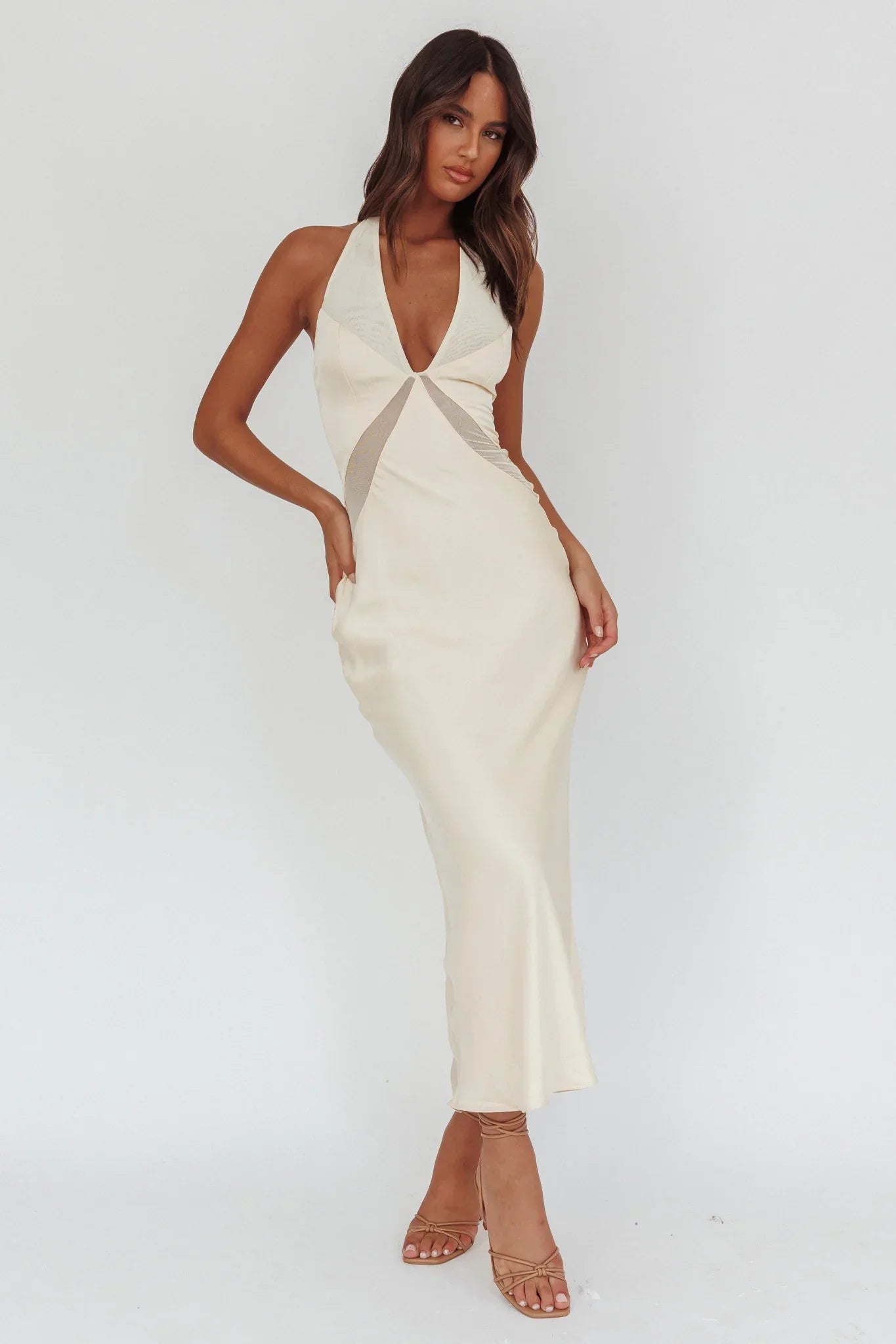You will feel like a goddess in our stunning Kasi maxi dress. We are in love with its unique, sheer panels and halter design. Perfect for a wedding or special birthday soiree! Team it with nude heels and a clutch for an unforgettable look.