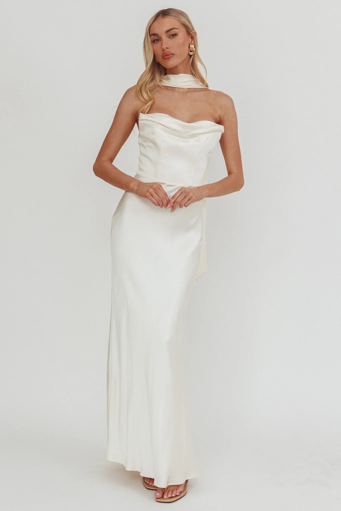 Light up the room in our gorgeous Navi maxi dress. It features a separate scarf and pretty lace- up back detail. It's begging to be worn to your wedding reception or a special event. Team it with nude heels and a clutch for an unforgettable look.