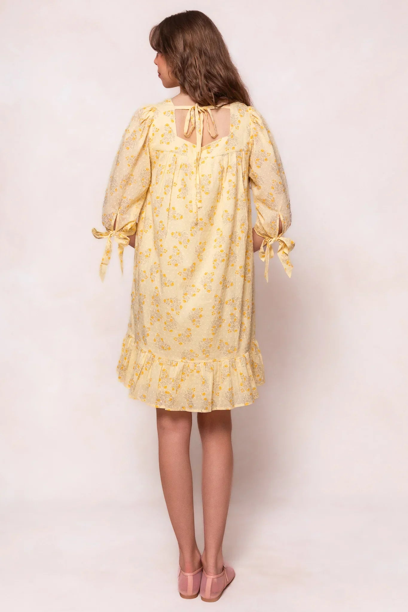 The Sunny Dress in Yellow Floral is designed to brighten every moment. Crafted from swiss dot cotton fabric adorned with a delicate floral print, she features a square neckline and 3/4-length flowy sleeves with adjustable ties. The knee-length silhouette and hidden pockets make her as practical as she is pretty.