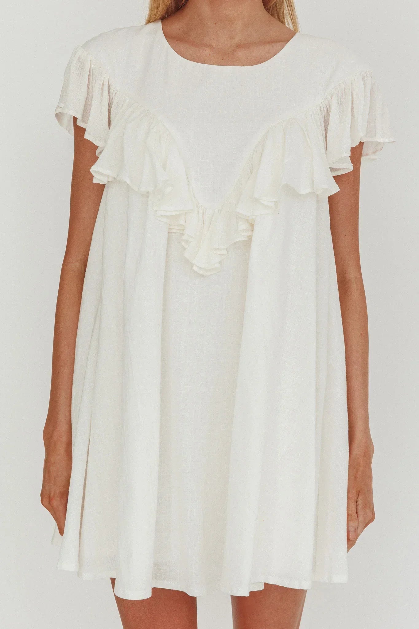 Twirl the day away in our gorgeous Sunshine Weekend mini dress. It features a super cute frill trim and babydoll silhouette. It's perfect for a brunch date with your besties teamed with kitten heels and a tote for a look we are loving.