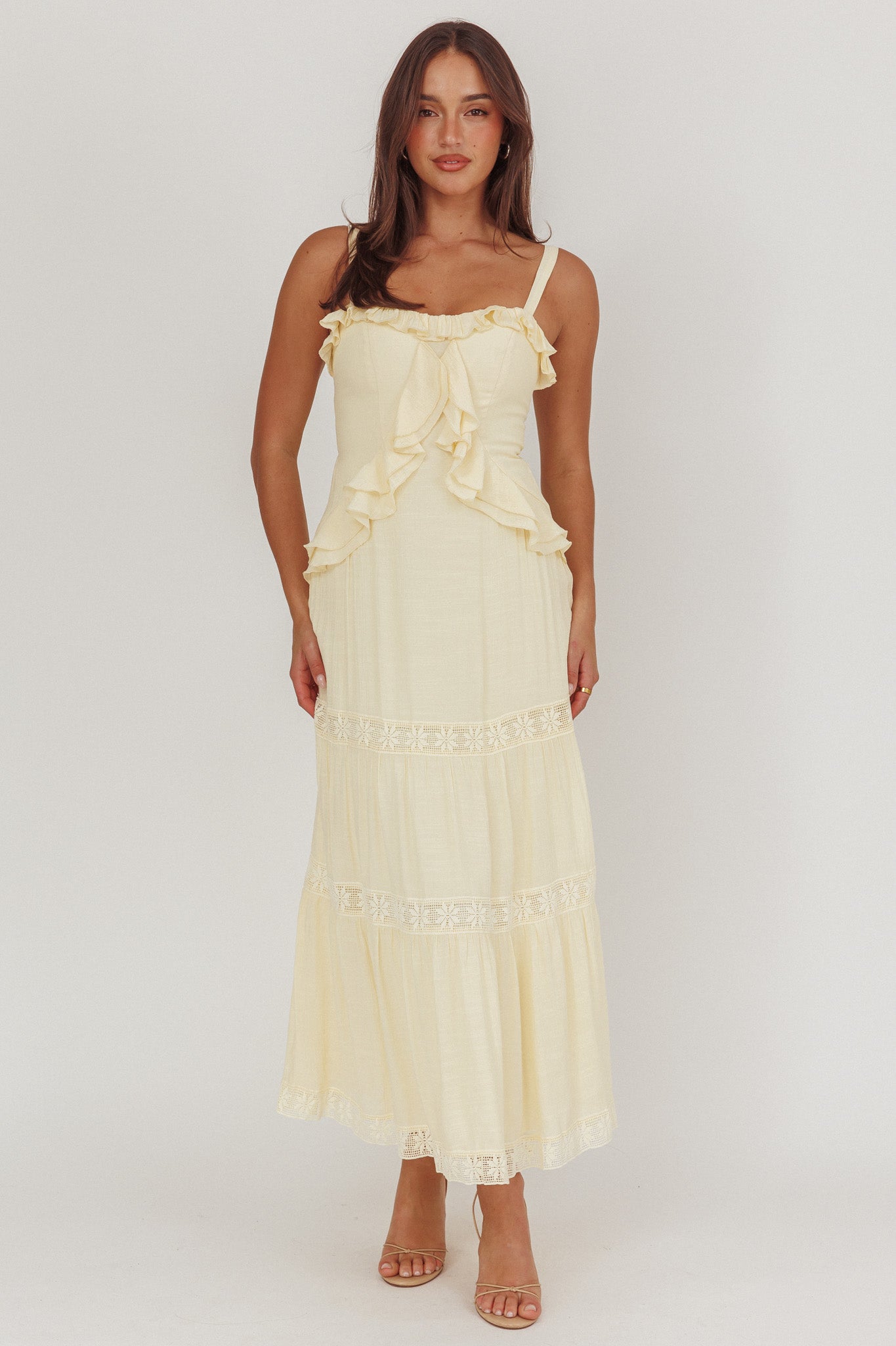 Make jaws drop in the stunning Vienna Sky maxi dress. It features a pretty crochet lace and ruffle trim. It would look amazing worn to a special birthday dinner teamed with strappy block heels and a tote for a head-turning look.