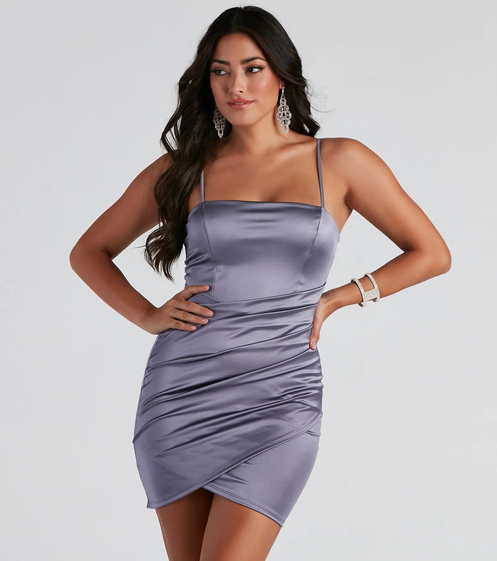 Get all wrapped up in this stylish sleek satin mini dress. Dance the night away at that upcoming wedding or celebrate a girl's night in this statement dress that will have all eyes on you. The dress features a sleeveless square neckline, spaghetti straps, and a ruched wrap silhouette that hugs curves in all the right places. The mini-length dress is composed of a satin-like fabric that offers a moderate stretch. Complete your look with and strappy heels.