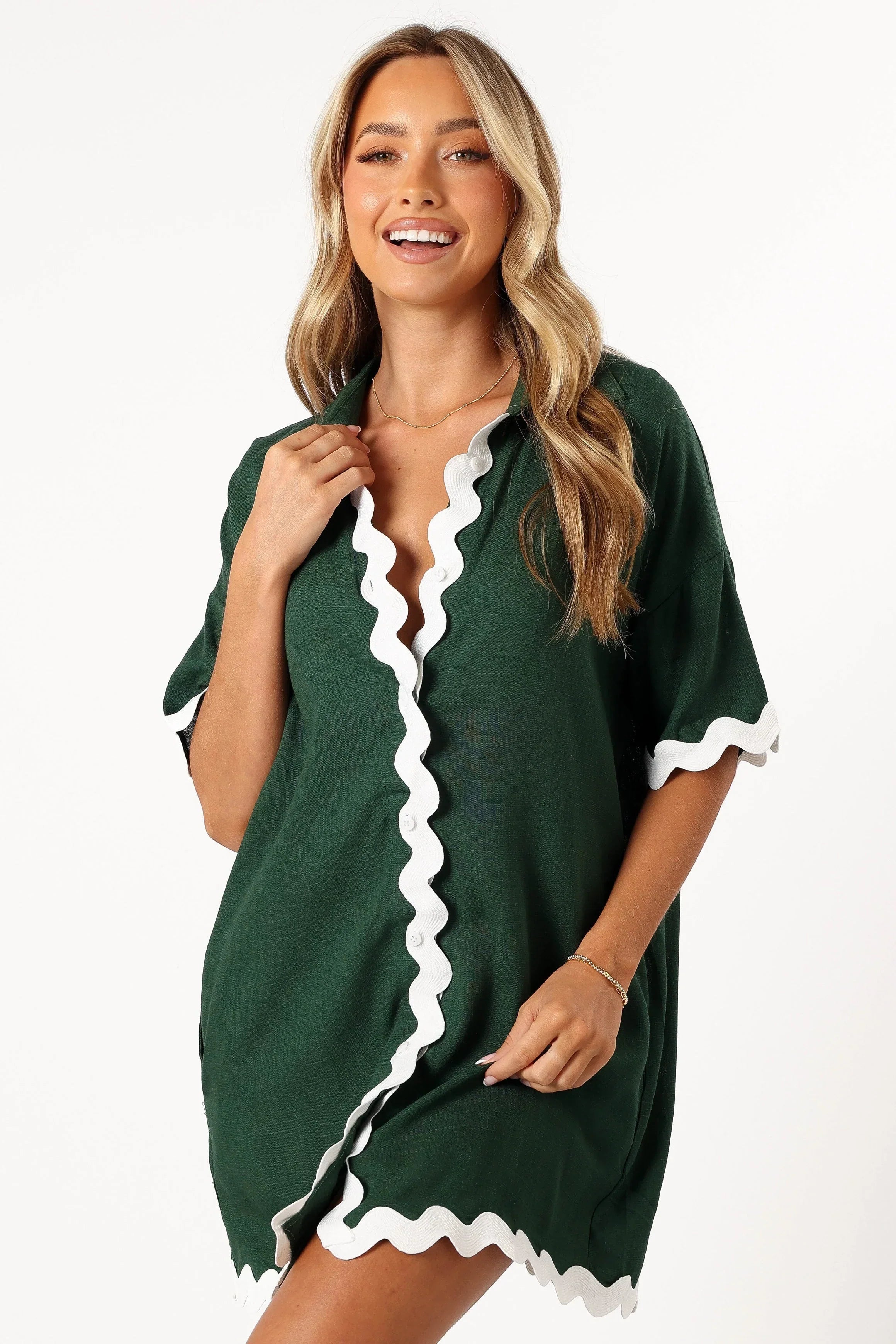DETAILS Embrace the essence of summer with this playful, fashion-forward mini dress! The daring V-neckline and short sleeves keep you feeling breezy, while the functional button-down design adds a trendy touch. But let's not forget about those side pockets - they're not just practical, they're undeniably chic!